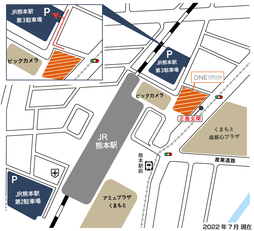 ※駐車場のご案内参照■カーナビまたはスマートフォンのマップアプリで直接駐車場までお越しになられる方は、「ワン・ステーションホテル熊本」と入力されても駐車場入り口を示さない場合もございますので「JR熊本駅ビル 第3駐車場」とご入力いただき下記をご参照ください。